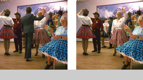 each showing a stereoscopic photo taken in the actual room behind.